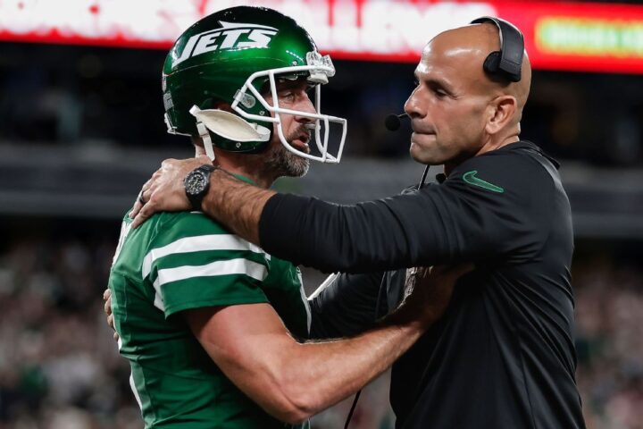 Aaron Rodgers, Robert Saleh laugh off denied hug as Jets roll