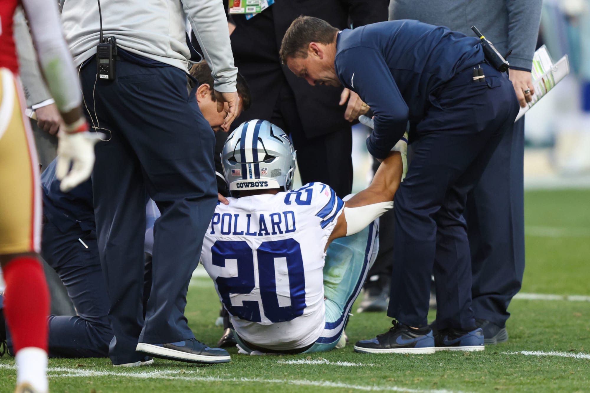 SANTA CLARA, CALIFORNIA – JANUARY 22: Tony Pollard #20 of the Dallas Cowboys is assisted by medical staff after suffering an injury against the San Francisco 49ers during the second quarter in the NFC Divisional Playoff game at Levi’s Stadium on January 22, 2023 in Santa Clara, California. (Photo by Lachlan Cunningham/Getty Images)