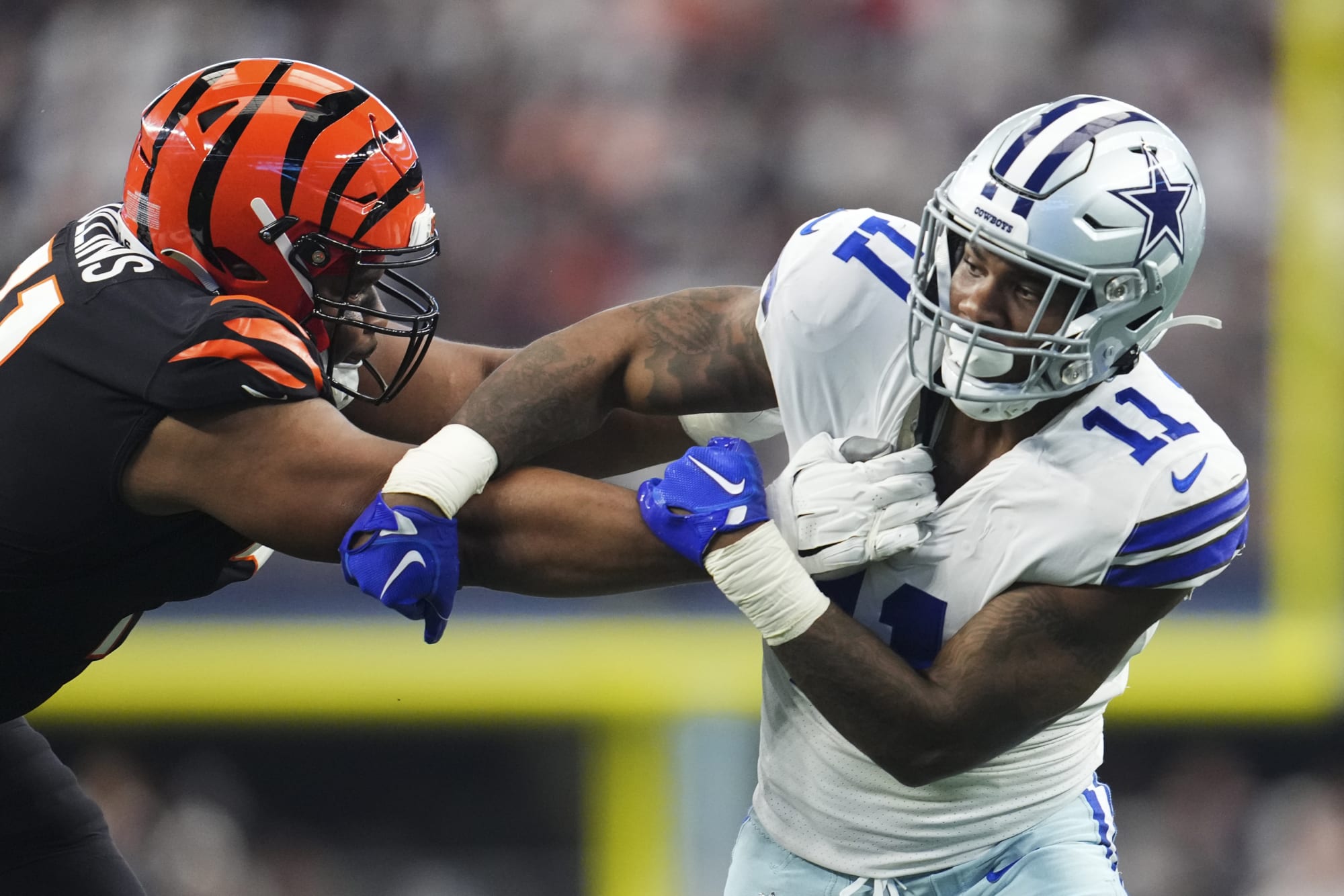 ARLINGTON, TX – SEPTEMBER 18: Micah Parsons #11 of the Dallas Cowboys battles with La’el Collins #71 of the Cincinnati Bengals at AT&T Stadium on September 18, 2022 in Arlington, Texas. (Photo by Cooper Neill/Getty Images)
