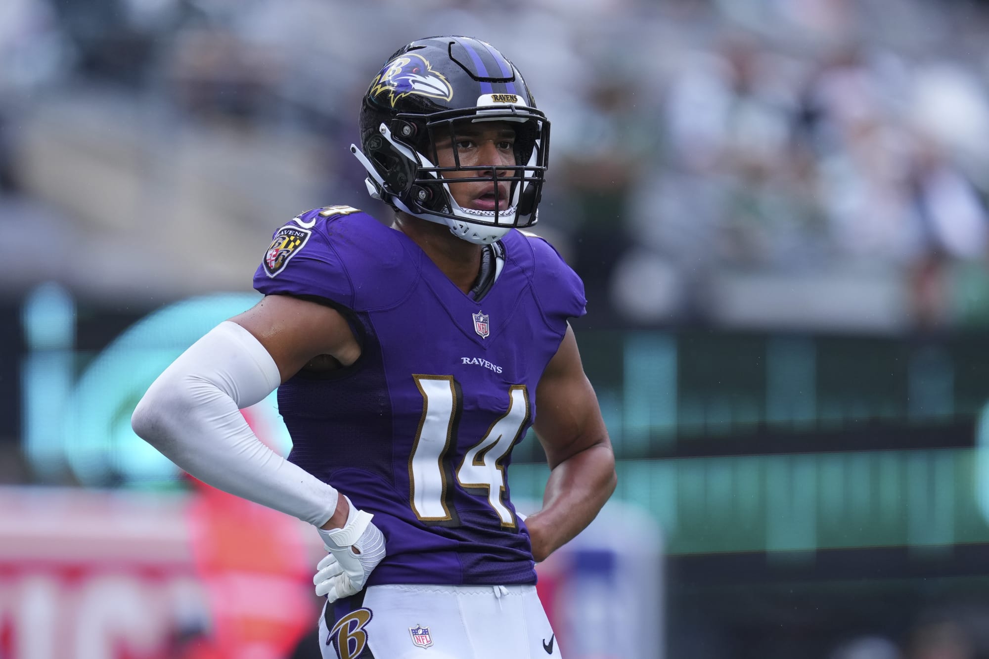 EAST RUTHERFORD, NJ – SEPTEMBER 11: Kyle Hamilton #14 of the Baltimore Ravens looks on against the New York Jets at MetLife Stadium on September 11, 2022 in East Rutherford, New Jersey. (Photo by Mitchell Leff/Getty Images)