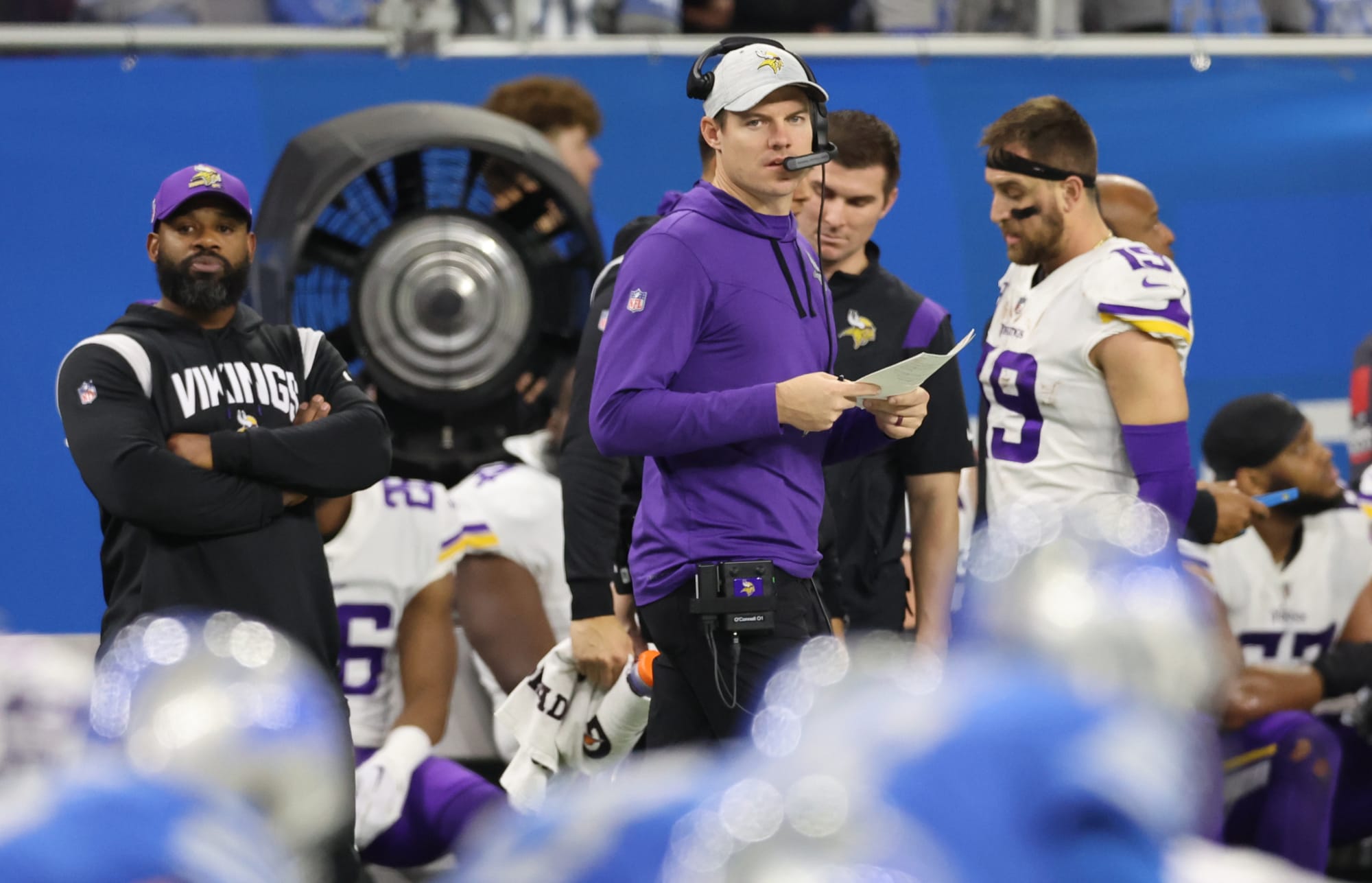 DETROIT, MICHIGAN – DECEMBER 11: Head coach Kevin O’Connell of the Minnesota Vikings looks on during the third quarter against the Detroit Lions at Ford Field on December 11, 2022 in Detroit, Michigan. (Photo by Gregory Shamus/Getty Images)
