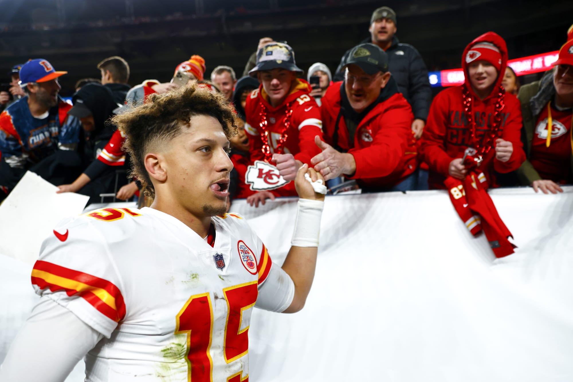 DENVER, COLORADO – DECEMBER 11: Patrick Mahomes #15 of the Kansas City Chiefs celebrates with fans after defeating the Denver Broncos 34-28 at Empower Field At Mile High on December 11, 2022 in Denver, Colorado. (Photo by Justin Edmonds/Getty Images)